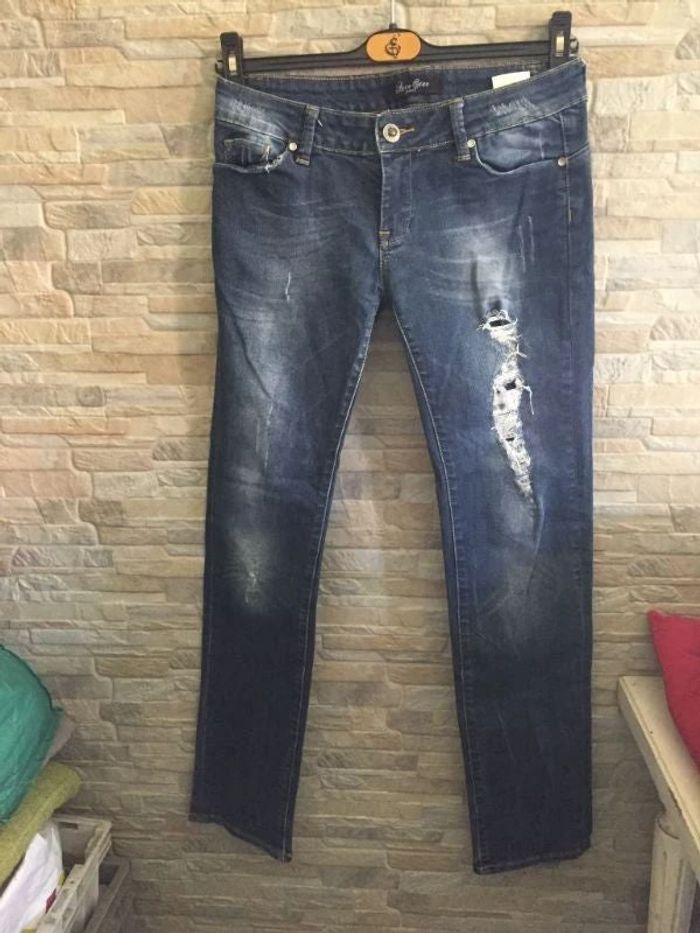 Jean troué Acce Star 42 - largeur ceinture à plat 42 cm, longueur entrejambe 76 cm, longueur totale 99 cm, 98% coton, 2% élasthanne - TBE