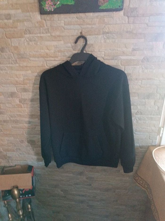 Sweat noir à capuche XL. Épaules 54 cm. Aisselles 58 cm. Manches 54 cm. Longueur 60 cm. 100% polyester. TBE