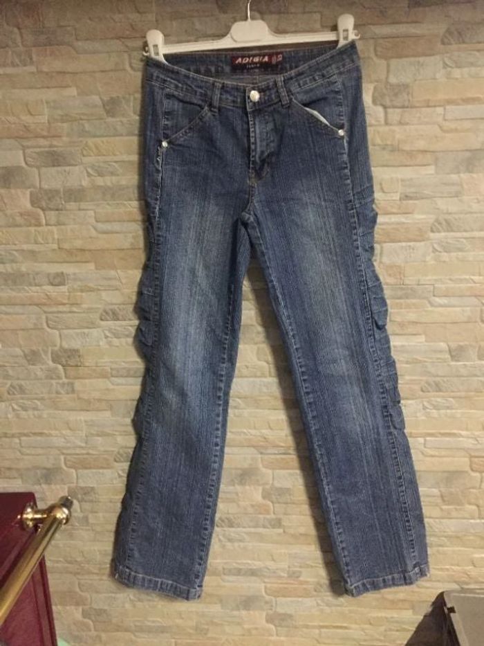 Jean fantaisie Adigia, taille S, longueur 100 cm, largeur ceinture 34 cm, côté des jambes à petits plis, 95% coton, 5% élasthanne - TBE
