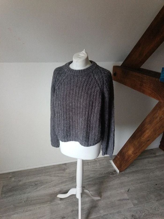 Pull court gris en laine mohair Kiabi M/38. Aisselles 60 cm. Manches raglan 66 cm. Longueur 50 cm. TBE