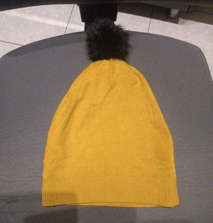 Bonnet moutarde à pompon noir. Hauteur 30 cm. Largeur 28 cm. 100% acrylique. TBE