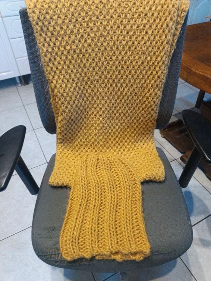 Ensemble écharpe et bonnet moutarde. Longueur écharpe 80 cm. Largeur 38 cm. Bonnet hauteur 36 cm. Tour de tête largeur 30 cm. 100% acrylique. TBE