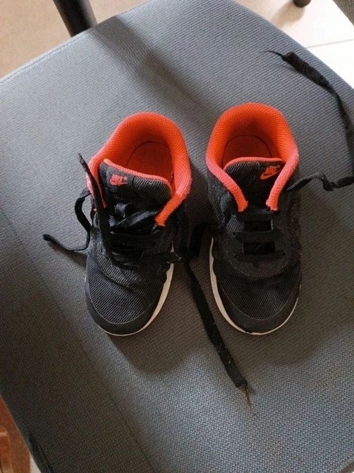 Sneakers noires/orange Nike Air, pointure 27, 1 bout râpé, à finir dans le jardin, bon état.