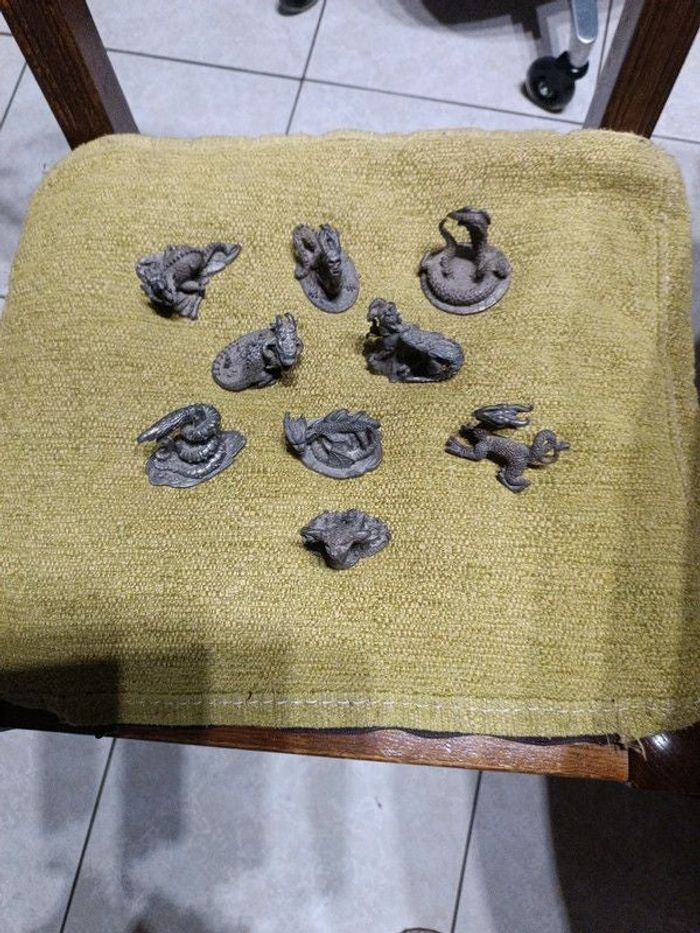 Lot 9 Figurines en métal (ce n'est pas du plomb, mais c'est lourd). Divers dragons. Hauteur environ 6 cm et diamètre environ 6 cm. TBE