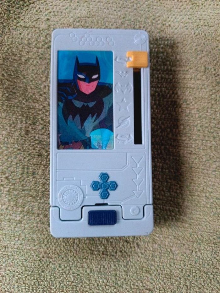 Boitier de cartes Justice League. Curseur jaune pour choisir la carte. S'ouvre avec un bouton pressoir. Petit cadeau. Hauteur 14 cm. Largeur 6.5 cm. Épaisseur 2 cm. TBE