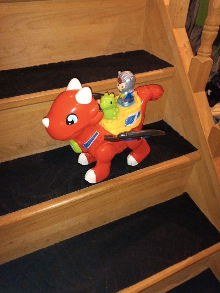 William le gentil dragon flamme. VTech. Avance en chantant et crache des flammes. Hauteur 28 cm. Longueur 34 cm. Largeur ailes ouvertes 25 cm. Chevalier + bébé dragon. TBE