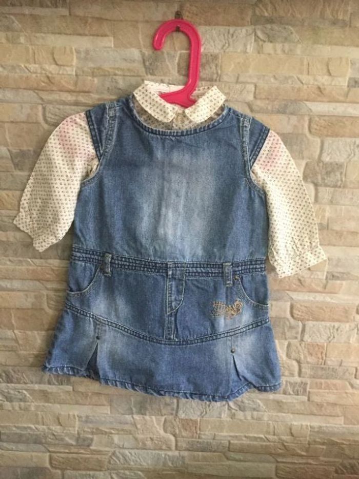 Ensemble 18M, robe jean TAO, 100% coton & chemisier fleuri, 65% polyester, 35% coton - TBE