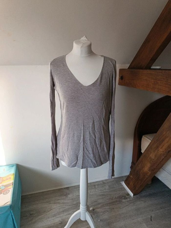 Pull fin gris Promod 38. Épaules 38 cm. Aisselles 50 cm. Longueur 62 cm. Manches 65 cm. 100% coton. TBE