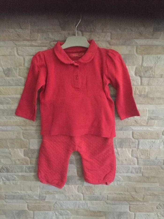 Ensemble Polo pantalon rouge Tissaia 9M, polo col claudine 2 boutons, pantalon fausses poches "petits chats", ceinture élastique, entièrement doublé, 100% coton - TBE