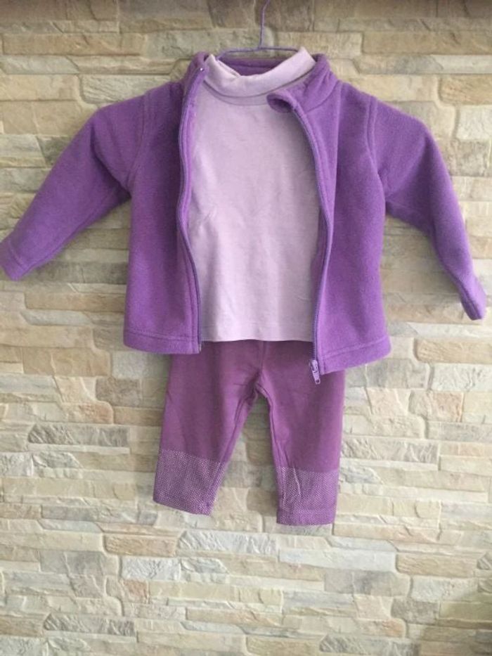 Ensemble 3 pièces violet/parme, Little Girl 9M, polaire violet 100% polyester, sous-pull parme 100% coton, caleçon violet, sérigraphie bas de jambe, coton élasthanne - TBE