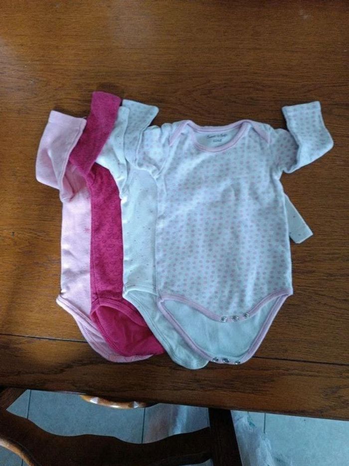 Lot 5 bodys 6M - 1, Body fuchsia Auchan, décor nuages - 2, Body rose Auchan, "Me ard my Kingdom" - 3, Body blanc étoiles roses Kiabi - 4, Body blanc pois roses Soft & Soft - 5, Body blanc "Dalmatien" Disney - 100% coton - TBE