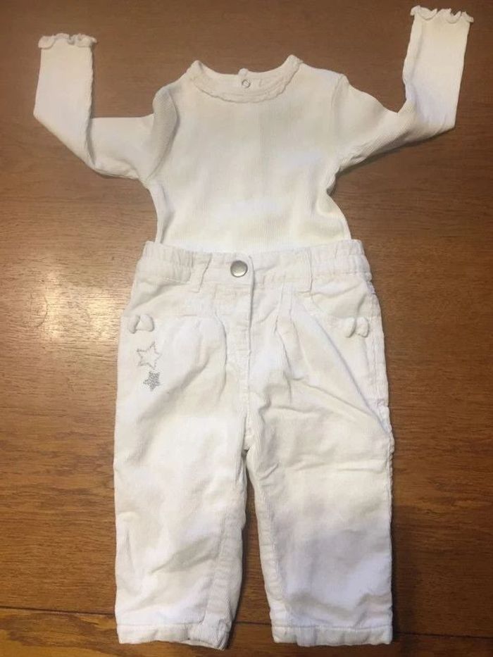 Ensemble Pull brassière crème Kiabi, fermeture dos 5 pressions et pantalon velours entièrement doublé Tissaia 6 mois, 100% coton côtelé, comme neuf - TBE
