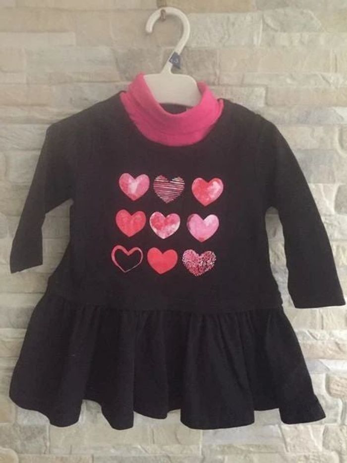 Robe noire col roulé, cœurs roses 6 mois, 60% coton, 40% polyester - comme neuve - TBE