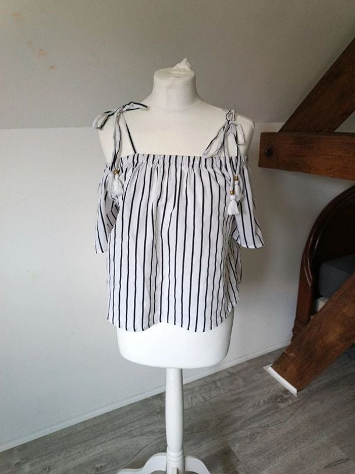 Top blanc à rayures marine, Tally Weijl S/36, épaules élastique 42 cm, aisselles 50 cm, longueur 38 cm. Liens à pompons à nouer sur épaules. Base arrondie. 100% polyester. TBE