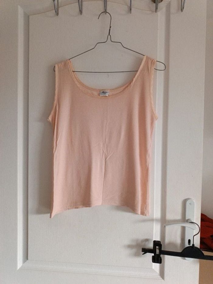 Débardeur saumon Alexa's 40, T3, épaules 34 cm, aisselles 48 cm, longueur 43 cm. 50% acrylique, 50% viscose. TBE