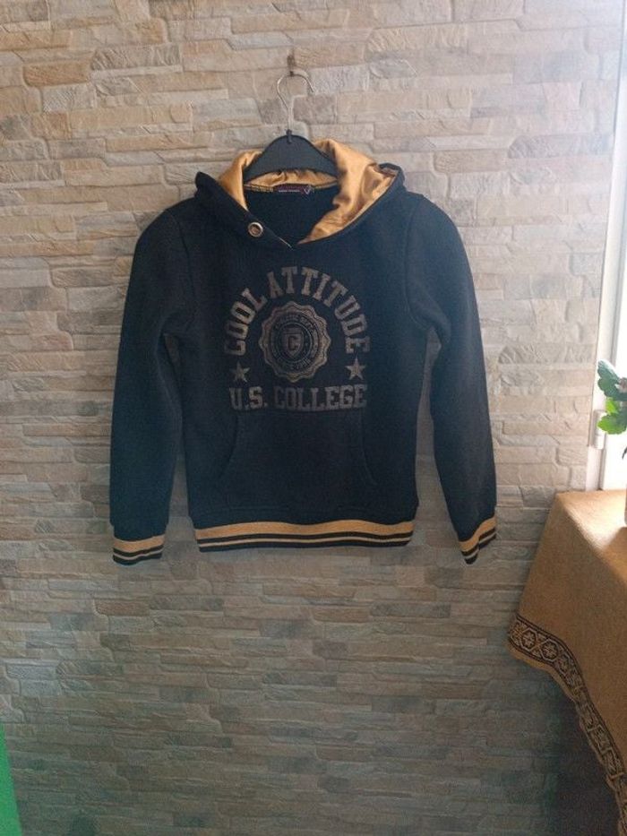 Sweat à capuche Cool Attitude S, noir/doré, poche kangourou, épaules 40 cm, aisselles 48 cm, longueur 56 cm . 60% coton, 40% polyester. Comme neuf. TBE