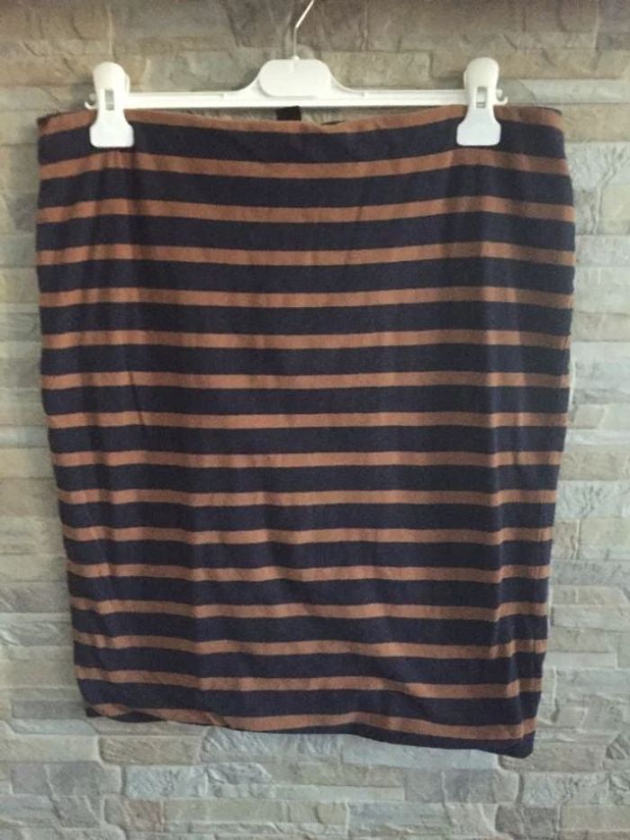 Jupe rayée marine/marron, H&M taille L/40, ceinture élastique 42 cm, longueur 55 cm, 93% coton, 7% élasthanne - TBE