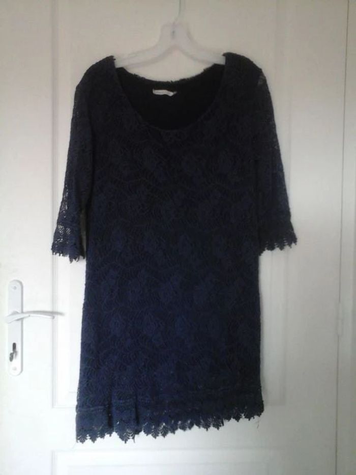 Robe marine macramé Micky 42, longueur 88 cm, largeur aisselles 48 cm, manches 3/4, entièrement doublée, 85% coton, 35% polyamide - TBE