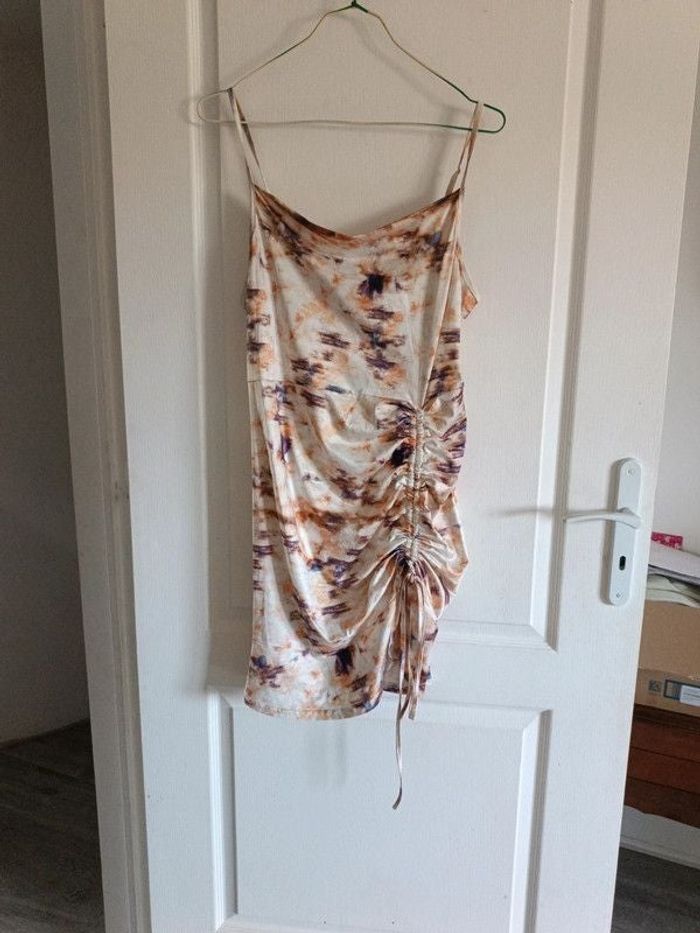 Robe dos nu 40, aisselles 46 cm, longueur 80 cm. Bretelles réglables. Lien coulissant devant. Base légèrement volantée. 65% coton, 35% polyester. TBE