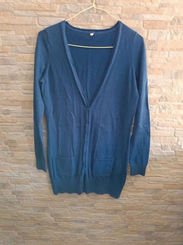 Gilet bleu Carrefour S/36, épaules 37 cm, aisselles 47 cm, longueur 78 cm, manches 64 cm. 80% coton, 20% polyamide. Bon état.