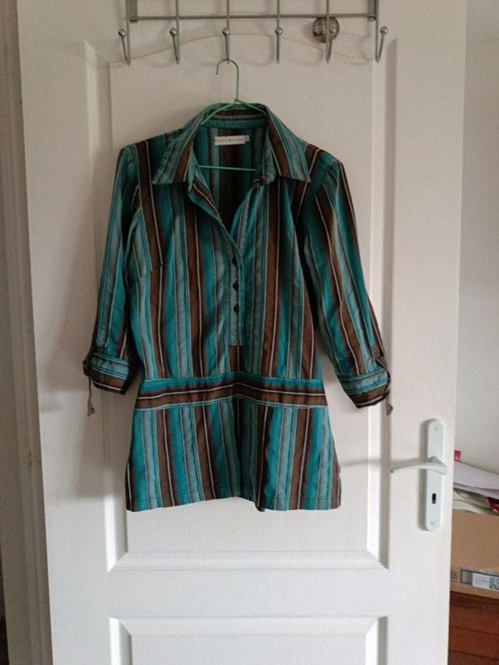 Tunique turquoise rayures marron, Cache cache T3/40. Épaules 40 cm, aisselles 50 cm, longueur 72 cm, manches 3/4 réglables 44 cm, 73% coton , 27% polyester. Comme neuve. TBE