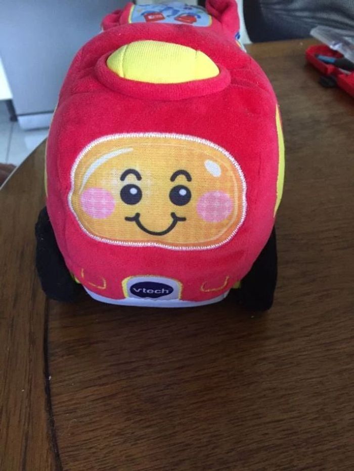 Tut tut Roulibou Barnabé camion de pompier tout doux Vtech, 3 boutons interactifs, sirènes ambulance, pompier et police, visage lumineux pour rouler et activer les chansons - Tissu et plastique - Avance tout seul. Fonctionne avec 3 piles LR6 AAA (non fournies) Contrôlé avant la mise en vente - TBE