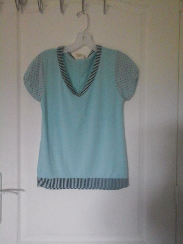 T-shirt bleu ciel pois rayures noir, taille L- manches courtes ballon froncées- Longueur 60 cm- largeur aisselles 42 cm, coton polyester élasthanne- TBE