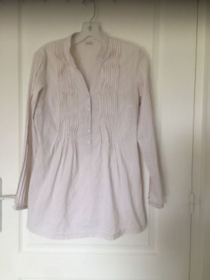 Chemise blanche Camaïeu 40, longueur 74 cm, aisselles 52 cm, plis piqués devant et manches, col tunisien, fermeture 5 boutons, coton - TBE