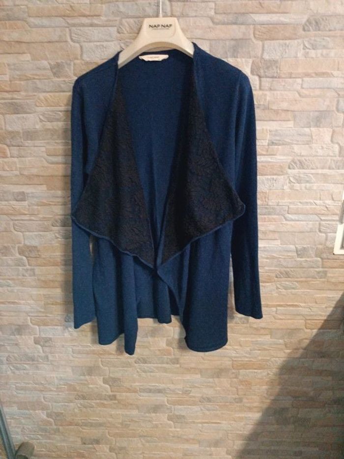 Gilet long ouvert marine Naf Naf 38/M, épaules 40 cm, aisselles 44 cm, longueur 68 cm, manches 56 cm, col recouvert de dentelle noire, 83% viscose, 16% polyamide, 1% coton. TBE
