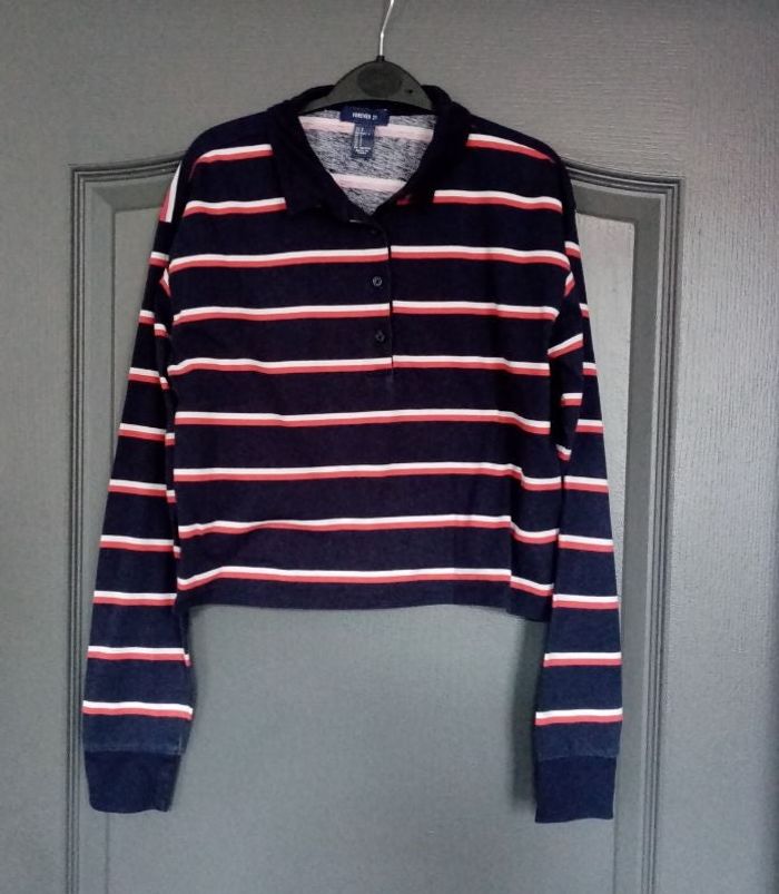 Tee-shirt de la marque Forever 21. Manches longues. Oversize court. Boutons. Couleurs : bleu marine, rouge, blanc. Taille : 36/S. Très bon état général. #evivi59fille36 #evivi59filles #evivi59femme36 #evivi59femmes Prix : 3,00 euros. N'hésitez pas à consulter mes autres annonces ! Possibilité de faire un lot pour diminuer les frais d'envoi. Avec articles + ou - du même prix, je vous propose de bénéficier d'une réduction de : - 15% à partir de 2 articles achetés, - 20% à partir de 3 articles achetés, - 25% à partir de 5 articles achetés.
