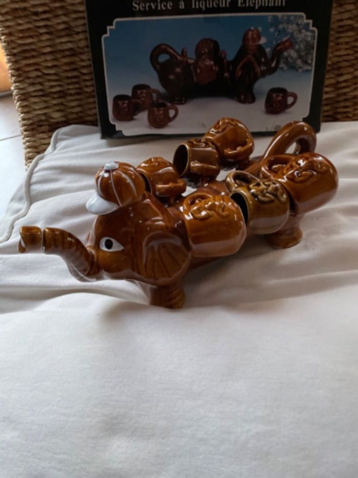 Service à liqueur, original et peint à la main 6 Petits verres et l’éléphant sert de contenant (avec deux bouchons. Sur la tête et la trompe( voir photo)