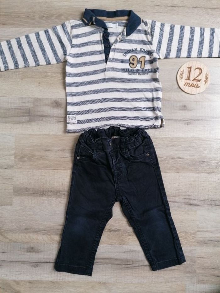 Pantalon marque boîte à malice taille reglable bon état et t-shirt gemo petit défaut sur le 9 voir photo 12 mois En bon état