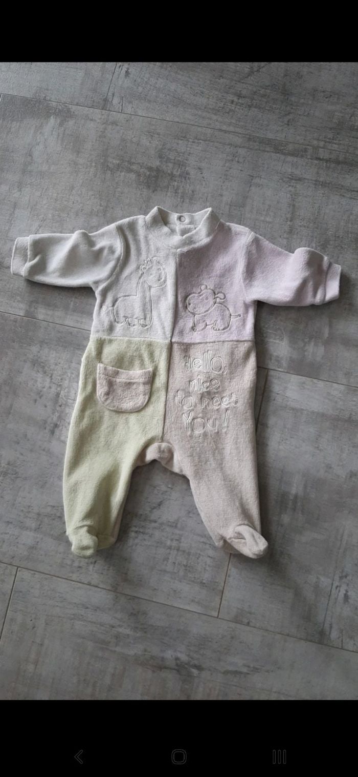 En bon état, sans trous ni tâches. Coloris pastels beige, vert, ecru et rose. Taille 1 mois.