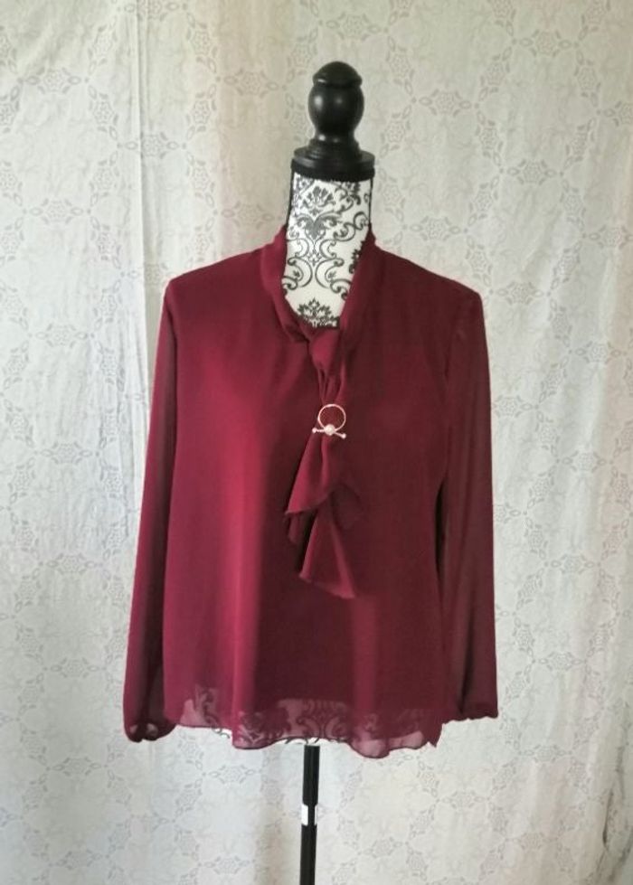 🌺 Dressing trié par # #didine91017femme40 Magnifique blouse en voile bordeaux vintage Légèrement transparente Sympa avec son bijou Plus l'étiquette de la taille Taille 40/42 En excellent état