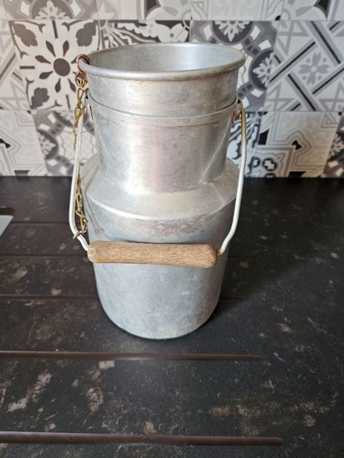 Vieille timbale à lait de 2L En très bon état Avec son couvercle et sa petite chaîne Simplement une petite bosse au fond Dimensions voir photos