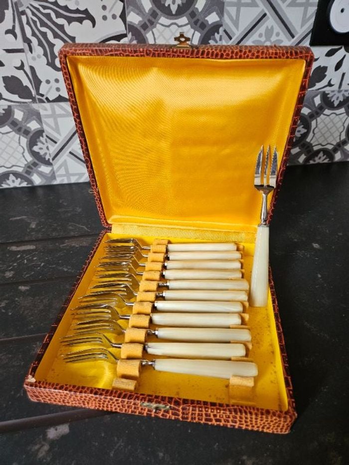 12 fourchettes à desserts comme neuve Manche en bakélite Et le reste en inox Boîte en bon état Prix négociable