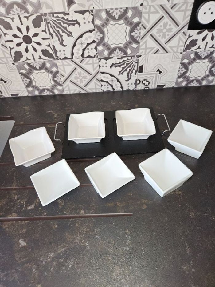 4 coupelles avec une forme carrée 3 petits bols 1 plateau ( quelques marques d usures voir photos )