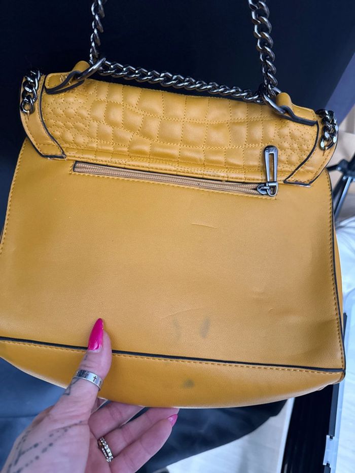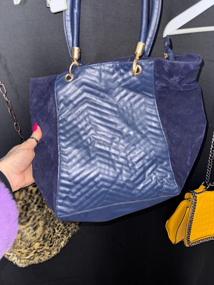 Alicia, c’est parfait, un sac bleu marine, ni troué ni taché un sac moutarde légère, tâche sur l’arrière noir. Photo petit prix