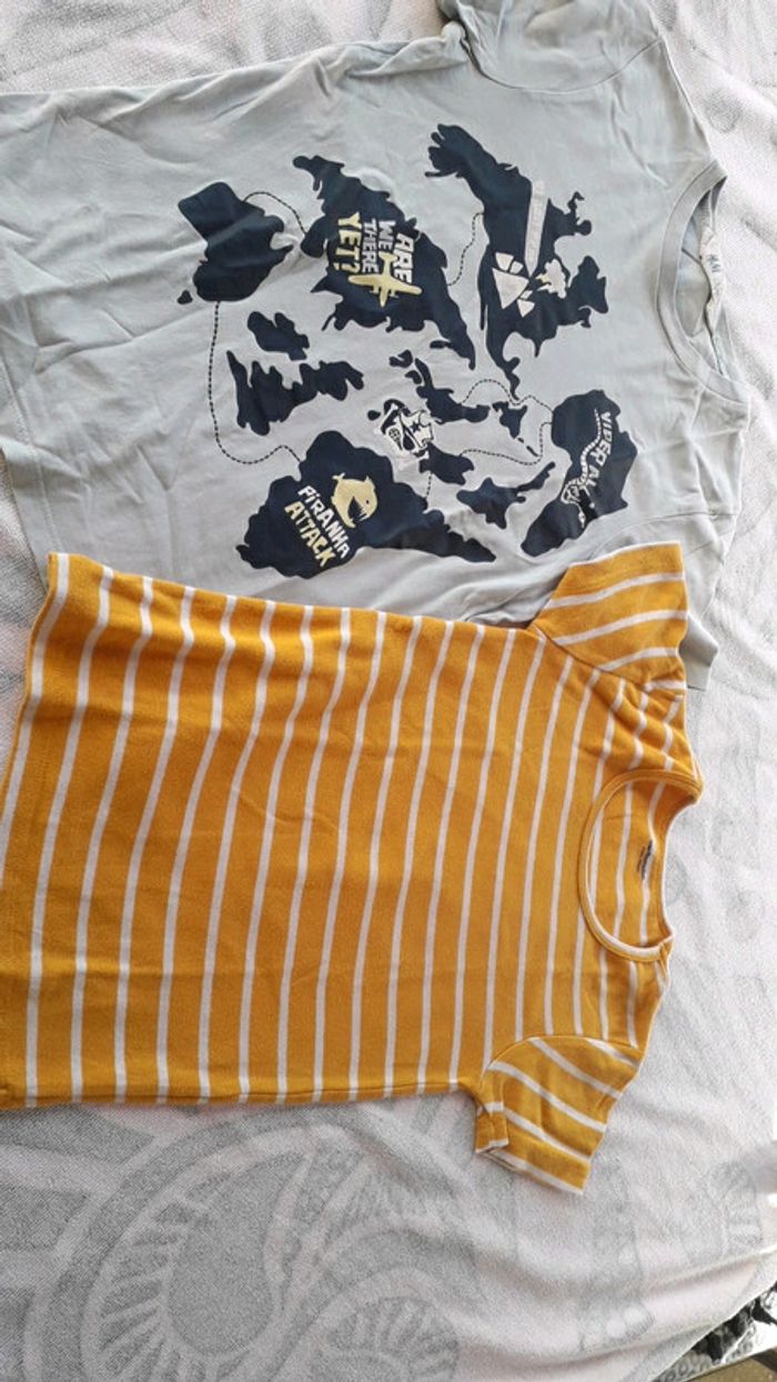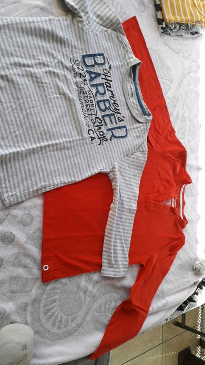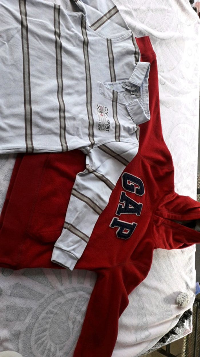 voici un lot de 6haut pour garcon taille 8ans 2 tee-shirt, * 1 bleu ciel marque H&M * 1 jaune à rayure blanc marque vertbaudet 2 pull ou sous pull * 1 rouge marque vertbaudet * 1 blanc et gris marque vertbaudet 2 gros pull * 1 bleu ciel rayure marron de chez Cyrillus * 1 a capuche rouge de Gap