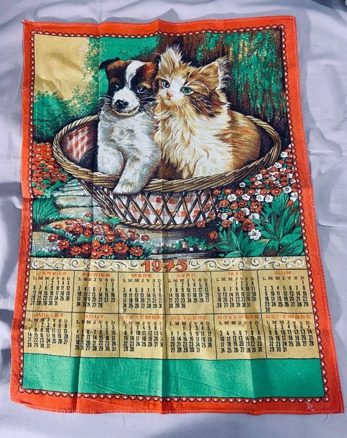 3 torchons calendriers vintage Jamais utilisés - 1975 (chiot et chaton) - 1982 (chevaux) - 1998 (les crêpes) -Maximo- + 1 torchon SANS calendrier (rue d’Alsace) #jorel26_collections #jorel26_vaisselle