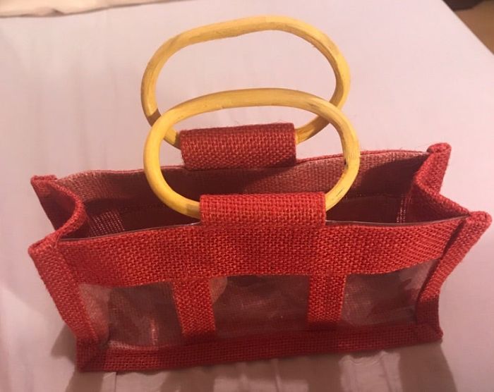 petit panier avec 3 compartiments vides pour petit pots de confiture ou autre Fenêtre transparente en plastique sur le devant en toile de jute rigide rouge foncé anses en bois peut servir comme contenant pour petits cadeaux #jorel26_sacs #jorel26_boites