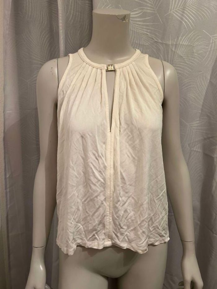 Vends débardeur blanc crème avec attache au col dorée, provenant du magasin H&M, en taille S (36). 🛍 N’hésitez pas à me contacter pour plus de renseignements, ou de photos. 📸 Bonne visite, à bientôt ! 🌸