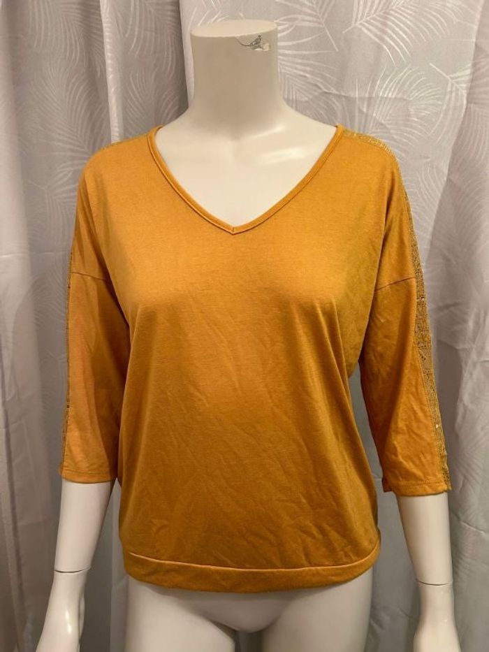 T-shirt jaune moutarde dentelle manches 3/4 S 36