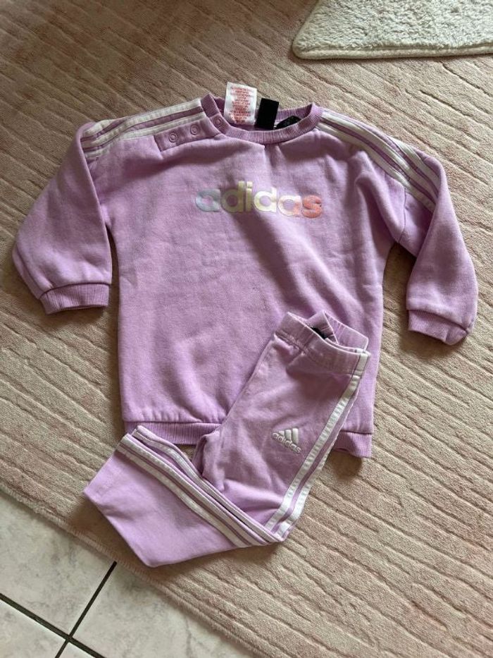 Vends ensemble lila/violet composé d'un pull et d'un legging, provenant du magasin Adidas, en taille 12-18 mois. 🛍 N’hésitez pas à me contacter pour plus de renseignements, ou de photos. 📸 Bonne visite, à bientôt ! 🌸