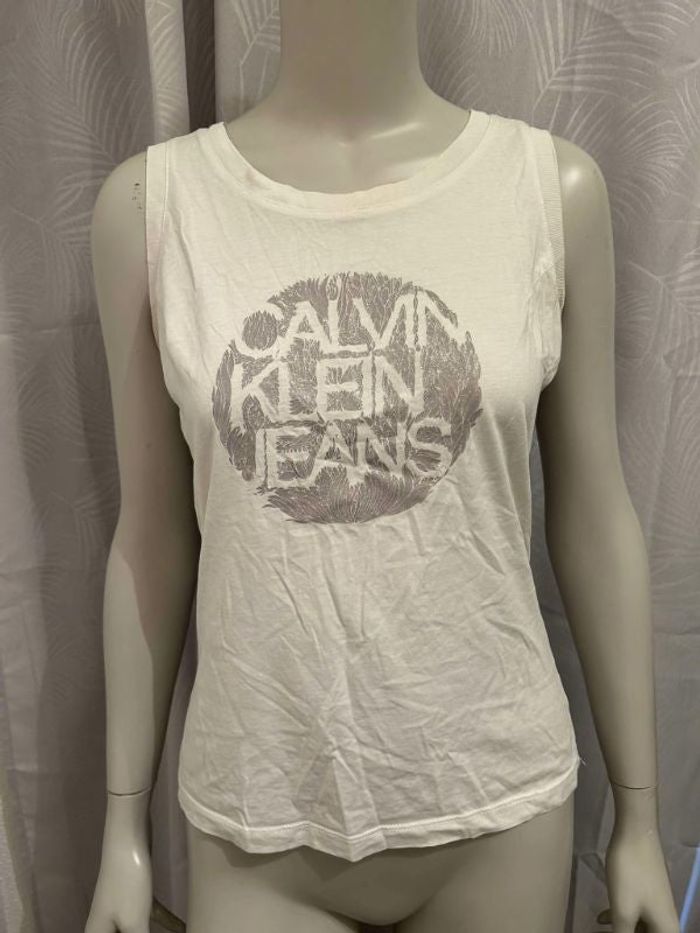 Vends débardeur blanc avec logo argenté pailleté, provenant du magasin Calvin Klein, en taille M (38). 🛍 N’hésitez pas à me contacter pour plus de renseignements, ou de photos. 📸 Bonne visite, à bientôt ! 🌸