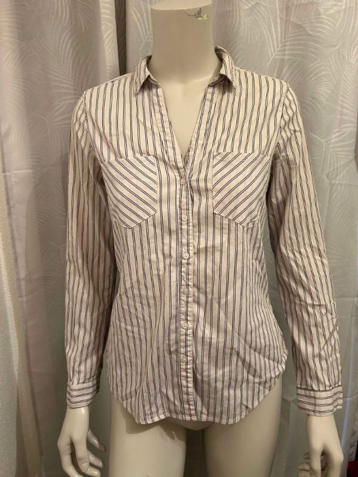 Vends chemise blanche avec rayures bleues marines, provenant du magasin Jennyfer, en taille M (38). 🛍 N’hésitez pas à me contacter pour plus de renseignements, ou de photos. 📸 Bonne visite, à bientôt ! 🌸