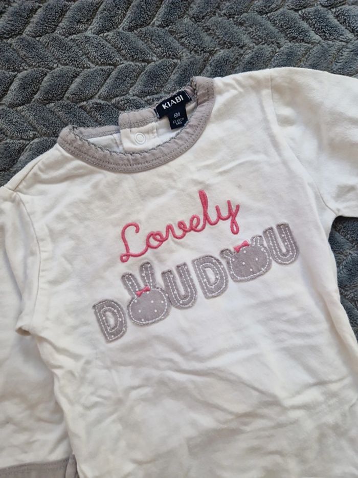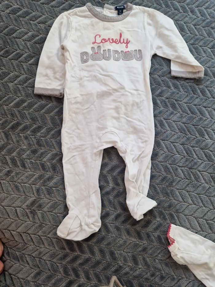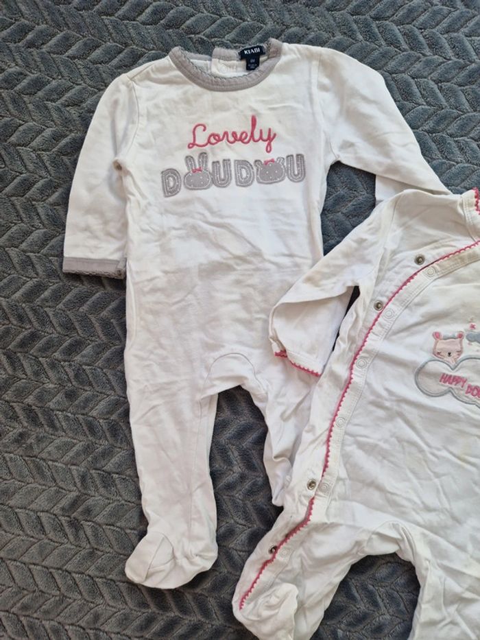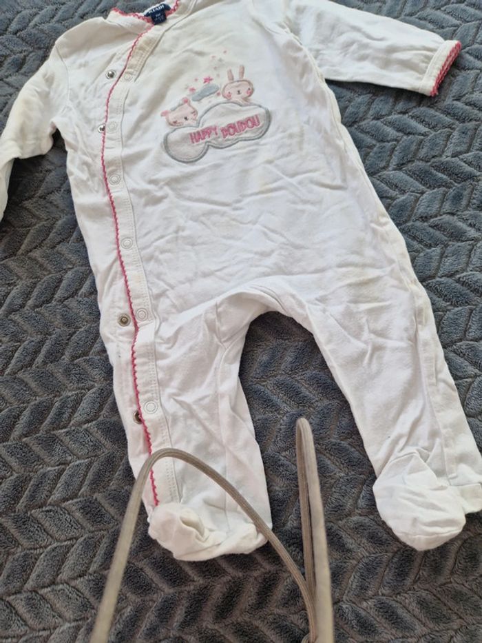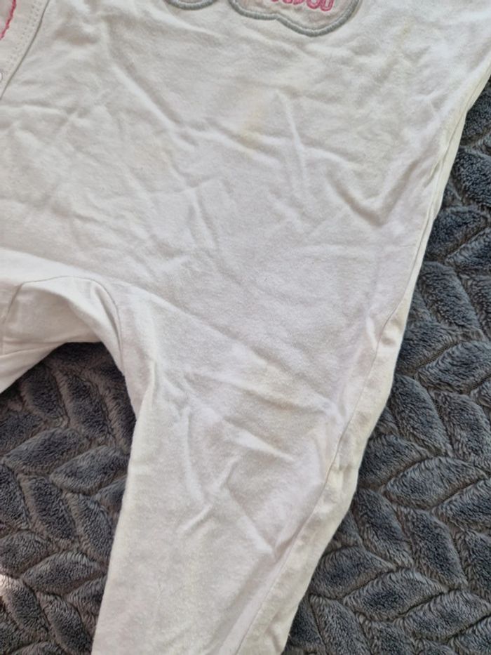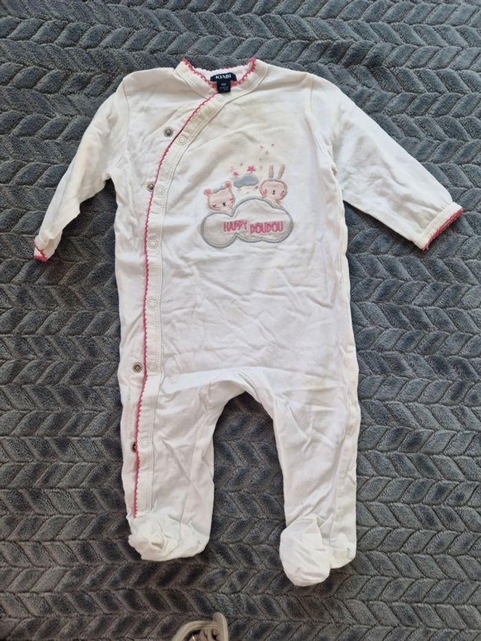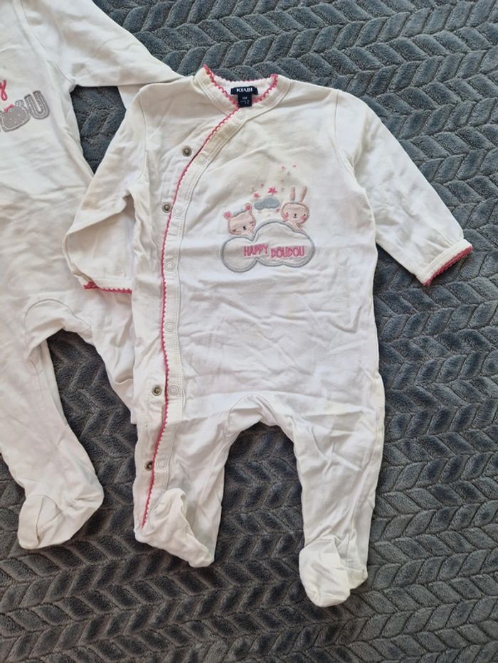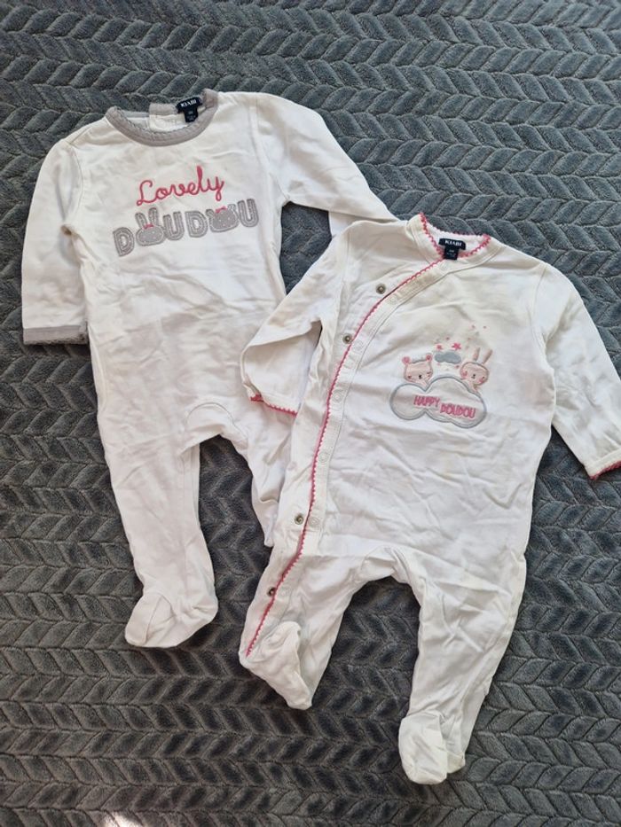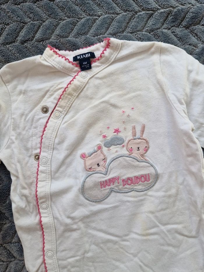 Pyjama fin Parfait pour la mi-saison Présentent des tâches au niveau du col et des jambes Mais peuvent encore servir Kiabi 6 mois #lucie_671_6mois #lucie_671_pyjama #lucie_671_lot