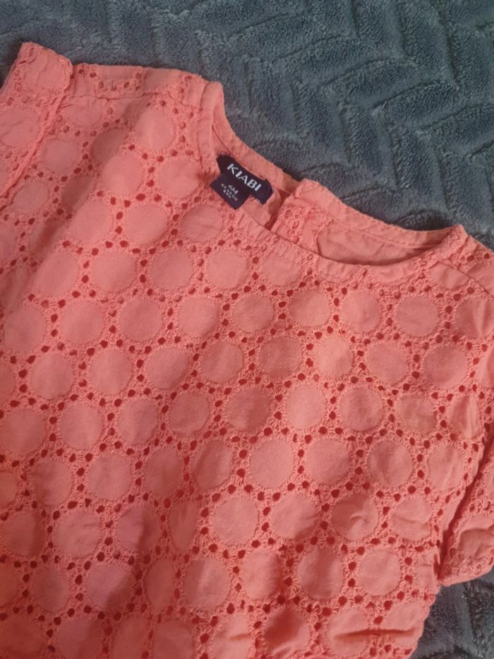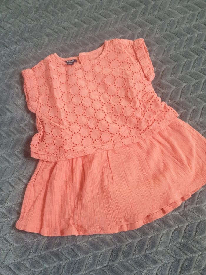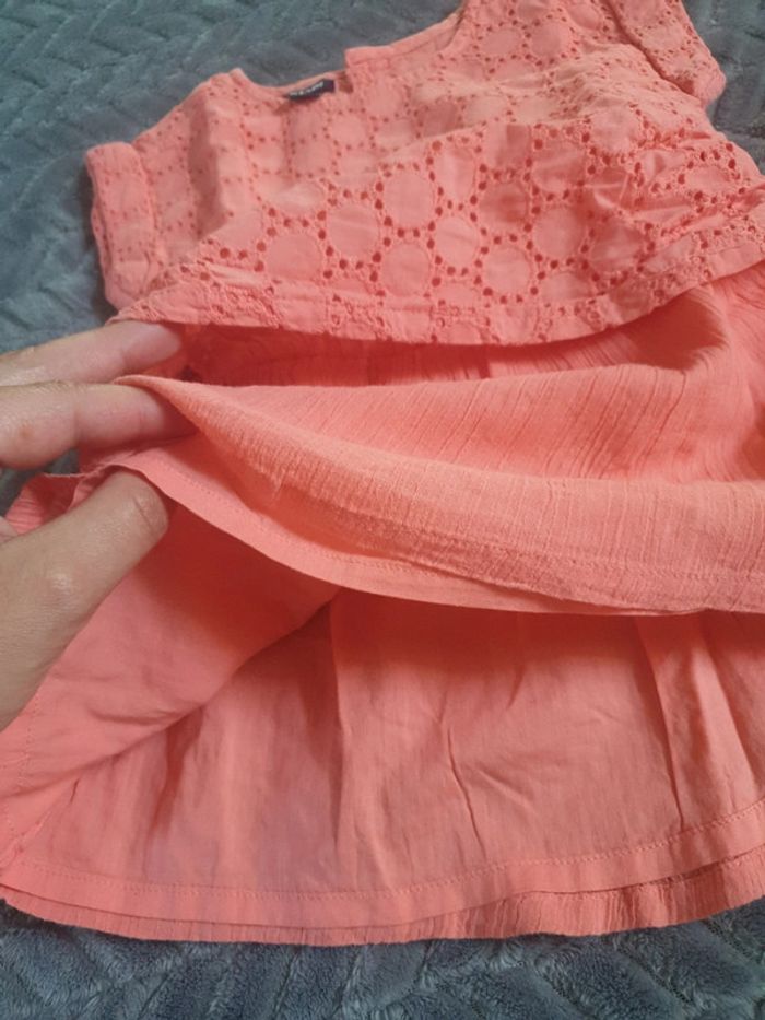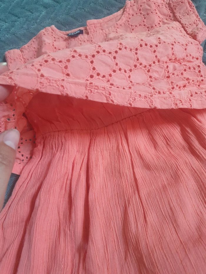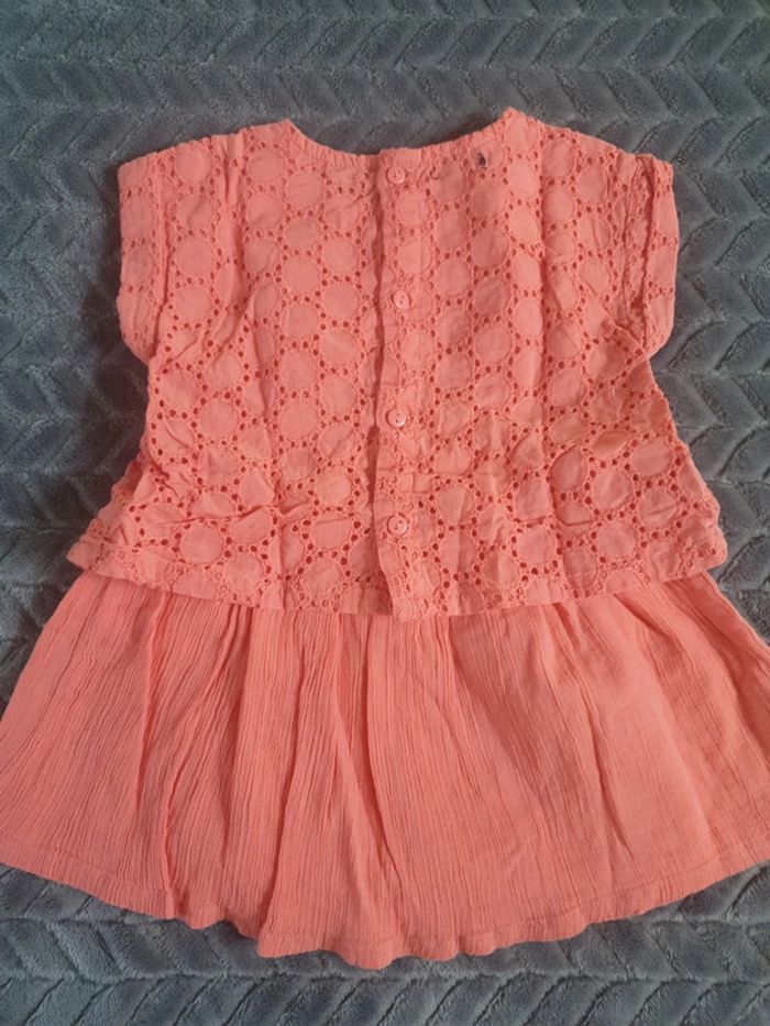 Robe à manches courtes Bi matière qui se superpose Motif Brodé rond de couleur saumon _ corail En excellent état Kiabi 6 mois #lucie_671_6mois #lucie_671_robe