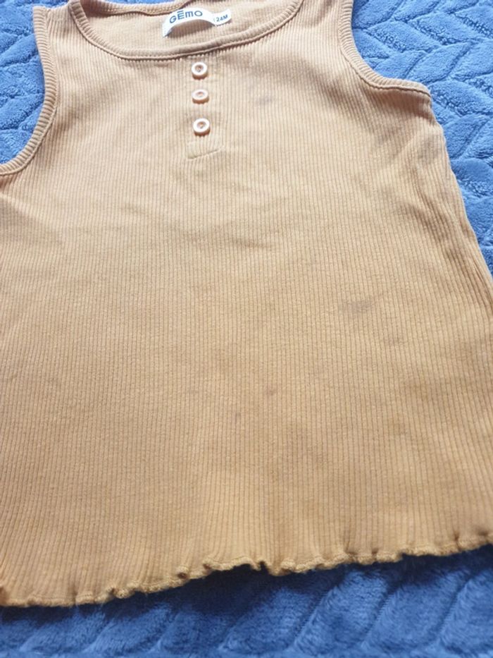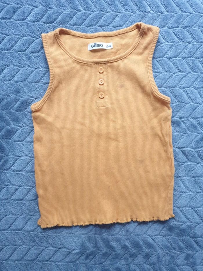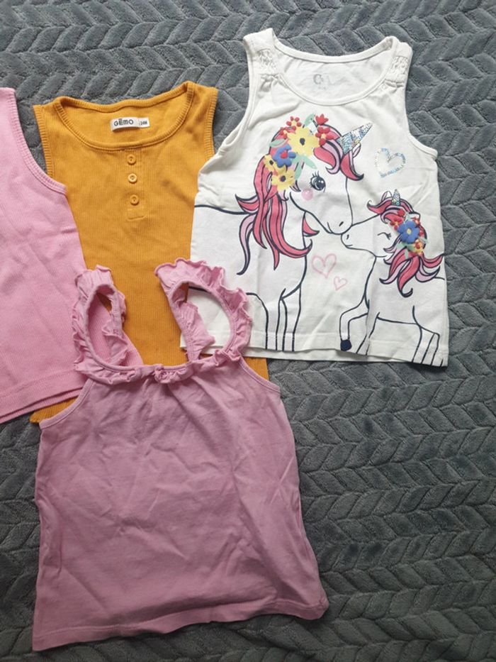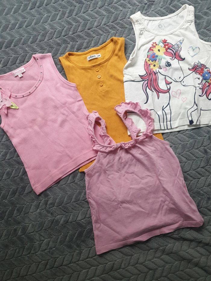 Lot de 4 débardeurs _ un rose détail fleur sur l'épaule droite _ un moutarde (quelques tâches qui ne partent plus, il a bien vécu mais peut encore être utilisé) _ un blanc motif licorne _ un rose Les autres sont en très bon état Diverses marques 2 ans #lucie_671_24mois_2ans #lucie_671_lot #lucie_671_tshirt