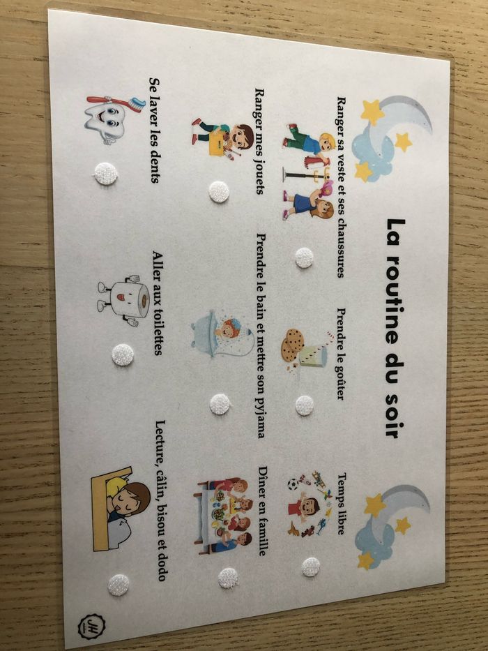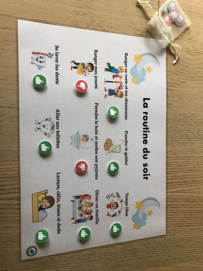 Fiche plastifiée à scratch. Apprendre de manière ludique le déroulement de la fin de journée. Le pouce levé de couleur verte à venir scratcher quand l’action est faite et le pouce vers le bas de couleur rouge quand l’action n’est pas faite ou s’est mal déroulé. La fiche est vendu avec un petit sac de 10 pouces vert et 10 pouces rouge